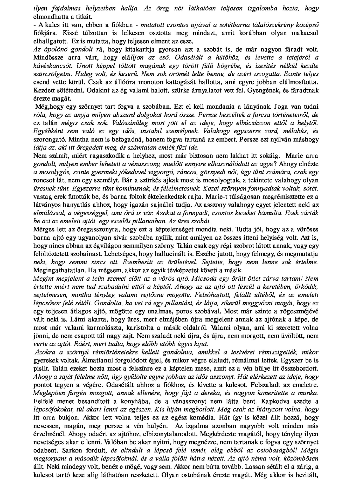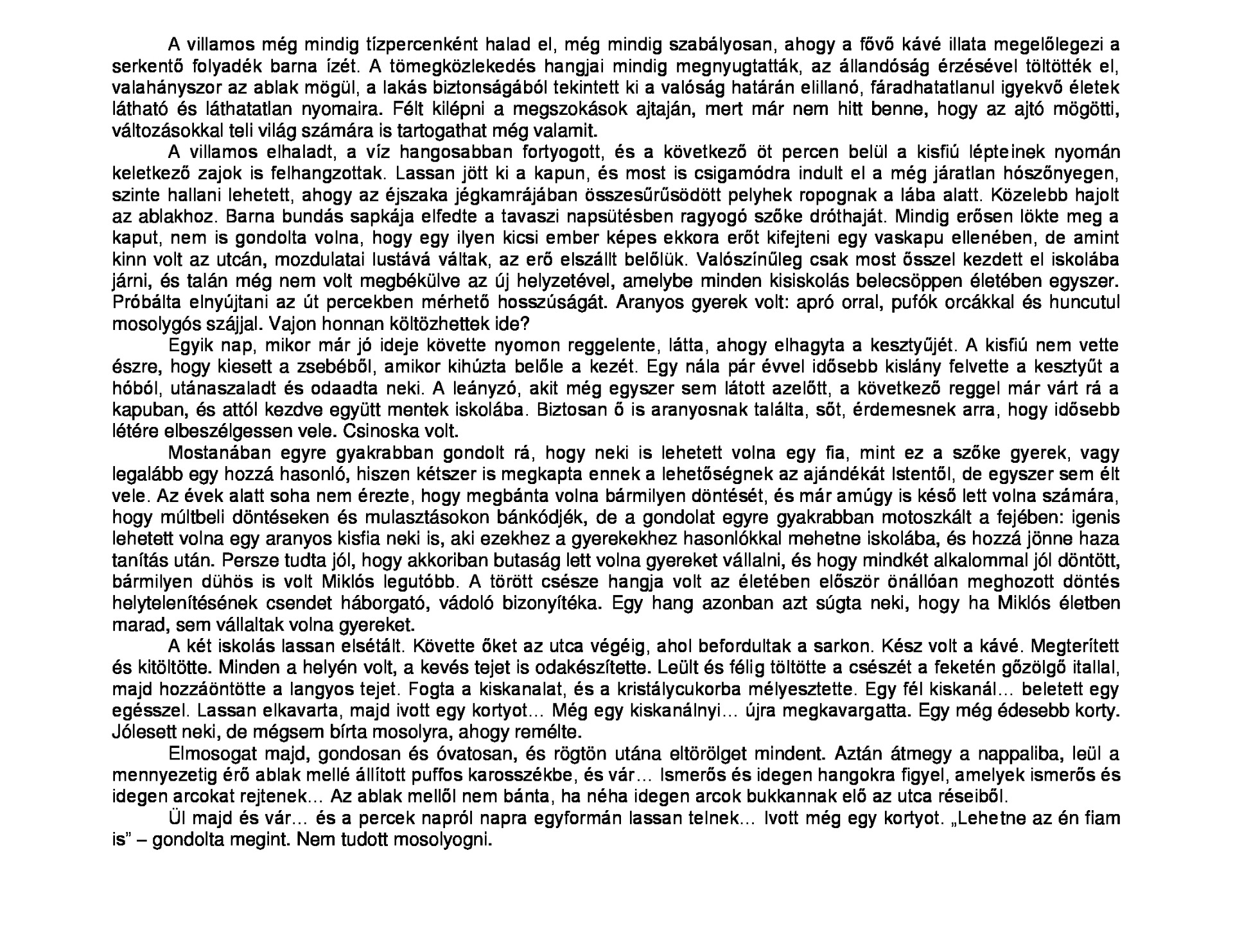 Kezét a hasára szorítva bement a szobába, s kinyitotta az utcára néző ablakot és Károlyt kémlelte. Sok vagonból álló tehervonat éppen akkor indult el az állomásról, mely lassan haladva tűnt el a kanyarban. Megborzongott, talán a kintről beáramló hidegtől, vagy a félelemtől, hogy eljött az idő, és ő egyedül van. Magára kapott egy kardigánt, és ismét kinézett. Látta, amint a szemben levő házból kijött Jancsi, a szomszéd gyerek, kezében a tejeskannát lóbálva.