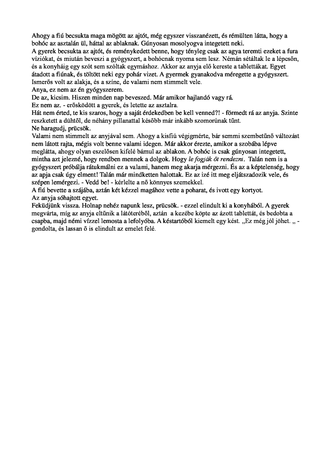 Két világ. Két világ között. Mikor forr már fel a víz? Ha felforr a víz, előkerül a kis doboz, az a mágikus, a kapszulákkal, tablettákkal és homokszerű törmelékkel. A másik világ. Reggel van. A férfi rosszul aludt. Rémes álmai voltak a valóságról. Halálról. Nem értette a halált, túl egyszerű volt. Semmi baj. Mindjárt felforr a víz és akkor vége lesz. Ha felforr a víz, és előveszi a dobozkát. Hazaér. A férfi összerezzent a jelző sípszóra. Remegő kezével beletúrt szőke hajába, lerázta a kezében maradt tincseket, leemelte a kannát a tűzről és ráöntötte kékeslila bögrében lapuló filterre. Ez volt a kedvenc bögréje. Benyúlt a dobozba, és kivett egy pirulát. Extasy. Remek. A nyelvére tette és nagyot kortyolt a teából. Átbotorkált a poros asztalhoz, várt egy pillanatig, majd belemarkolt a székbe, felemelte és ordítva a padlóhoz csapta. Sírva lehuppant a földre. Nem hat. Eszébe jutott egy emlék. A kislányával, amikor kavicsokat dobáltak a folyóba. Azóta sok év telt el. Szerette ezt az emléket, szívesen időzött benne. A lányán zöld kalap volt, fagyit kért, csokisat, de nem volt pénzük fagyira, és a kislány sírt. Ki ez a kislány? Az arca elfolyt, csengő hangja pedig sikoltásba torkollott. A férfi felemeli a fejét. A szoba is, mint a kislány, eltorzult, de mégis megrendíthetetlen nyugalom honolt. Hazaért. Vége. Valami még sincs rendben. A szürke kanapé mellett valami zöld dereng. Valahol látta már ezt a zöldet. Talán egy kép. Egy lámpa. A zöld közeledni kezd. Zászló. Bokor. Kalap. Igen, ez lesz az, kalap. Megint belemerül az emlékbe. A hideg szélbe a folyóparton, amitől bizsergett a feje búbja. Két kéz. Két márvány kéz ragadja meg a vállait, és ahogy felnéz, a kislányát látja, sír, mint mikor nem kapott fagyit. Valami mégis más, de a férfi nem tudja megmondani, micsoda. A lány szemei fagyosak, komolyak. A férfi megborzong. A lány arca megint elfolyik, zavarja a férfit, rosszkor jött, ilyenkor mindig kizárja a valóságot, az igazit, nem tud koncentrálni. Nem is akar. Éles csörömpölés hallatszik, a férfi megint kizökken. A lány nem tud nyugton maradni. Sikolt, meg dobál. Mit dobál? Ebben a házban egy dolgot lehet dobálni. Nem, a lány nem dobálhatja a másik világot. A férfi nem veszi észre, de ordít. Feltápászkodik a helyéről, meghallja a lány szavait, de nem érti. A lány vibrál. Fél? Ideges? Mérges? Toporzékol. Nagyon zavarja a férfit. A lány felveszi a földről a kis dobozkát, az ablakhoz fut és kihajítja. A hirtelen fény zavarja a férfit, megtántorodik, és meglöki a lányt. A lány csak visít. Hangosan. Hangosabban. Leghangosabban. A férfi a kezeibe fogja a lány arcát, vigasztalón, csendesen, majd minden erejét összegyűjtve a piszkos csempéhez vágja. Forróság önti el a férfi testét, ami a vöröses horpadásból fakad a lány fején. A férfi ujjain keresztül fut végig a karján, a hátán, a hasán, egyszerre megy fölfelé és lefelé, elér még a lábujjáig is. Ilyet még sosem érzett, zavarodott volt. Összekeverte a két világot. Sose megy haza. Vagy vissza. Azért jó lenne tudni, hogy ez a hely a valóság melyik éne. Az igaz, vagy az övé. Az egyik vagy a másik.