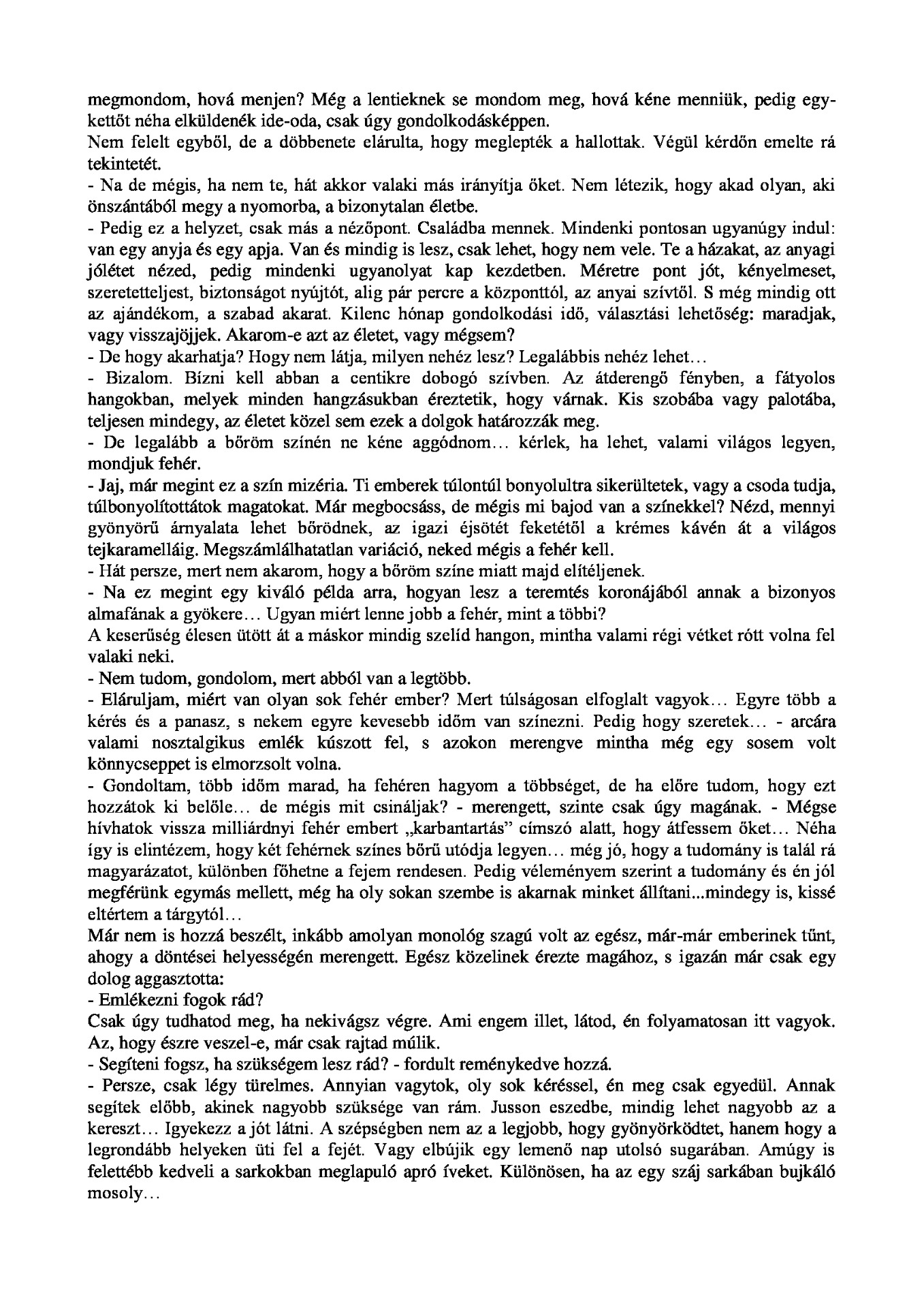- Mit teszek? - A kérdés üresen visszhangzik a fejemben, tovább gördül, és elakad száguldó gondolataim valamelyikében. Tisztán érzékelem a legtökéletesebb teremtmény jelenlétét a lelkemben. A krákogó hang, mint egy fekete holló telepedik le bűnös gondolataim egyikére, és érdeklődve tekint rám világtalan szemeivel.