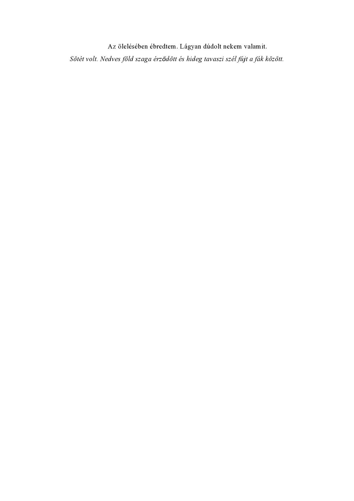Beesteledett. Tüzet raktunk. Gábor mellett ültem természetesen, és hallgattam a meséket, amiket ilyenkor az emberek a maguk borzongatására találnak ki. A tűz lángjának fénye visszaverődött a mellettünk álló néma csarnok falairól, és különös képeket rajzolt a málló vakolatra. A birtok elvadult kertje halk reccsenésekkel olvadt bele az őt pusztító valótlanságba, és hagyta, hogy az enyészet végleg megölje benne azt, ami valaha régen emberek sokaságának adott örömet, és szépséget. Talán fiatal párok romantikáztak a szőlőlugasok alatt, és szerelmek szövődtek a hatalmas tölgyek árnyékában? Ki tudja ezt már megmondani. A kert haldokolt, és mélyen hallgatott a titkairól. Dénes volt az első, aki felemelkedett, és Kinga követte őt. Várható volt. Hamarosan ők lesznek a következő pár, akik ebben a kertben találnak egymásra végleg? Elmosolyodtam a gondolaton, és tekintetemmel követtem őket, ahogy eltűnnek a csarnok nyitott ajtaja mögött. Mi jó fél óra múlva mentünk utánunk. Dénes, és Kinga egymás karjában feküdtek az ajtó melletti sarokba, és láthatóan elszenderedtek. Tibor megfogta a bátortalan Ildikó kezét, és lemosolygott a lányra.